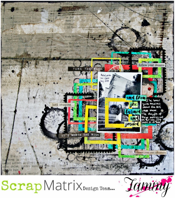 I painted the "Geometric Arrows", firstly with white gesso and then I added some Dylusions Ink Sprays in 'Polished Jade', 'After Midnight', 'Fresh Lime' and 'Vibrant Turquoise' (again from Scrap Matrix).